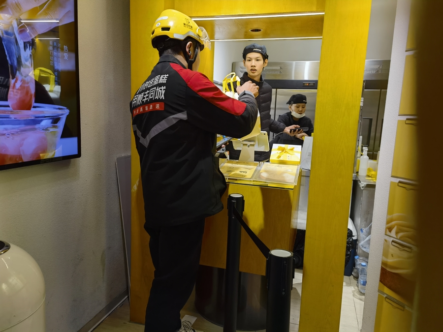“您的取餐号是多少?”店员小潘正礼貌地招呼前来取单的客人。每有骑手前来,小潘都会在递出蛋糕的同时,再递上一瓶水,“给您喝瓶水”,同时温柔提醒“蛋糕要小心一点拿”。